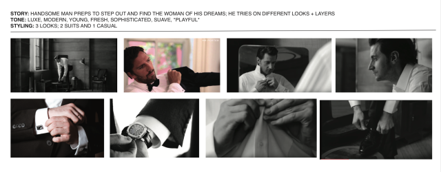 W asked that we show the Bachelor “getting ready to step out for a fashionable night” and to feature pops of red on a neutral, graphic background.